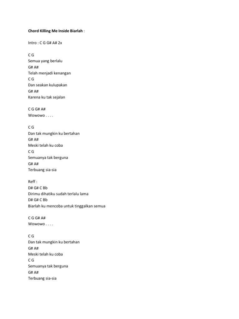 Ini chord gitar dan lirik lagu Biarlah - Killing Me Inside. G C sekarang semuanya menjadi air mata. Am Em F G Am Em dan tak mungkin F ku bertahan G meski telah ku coba Am Em F semuanya tak berguna G terbuang sia sia Reff.